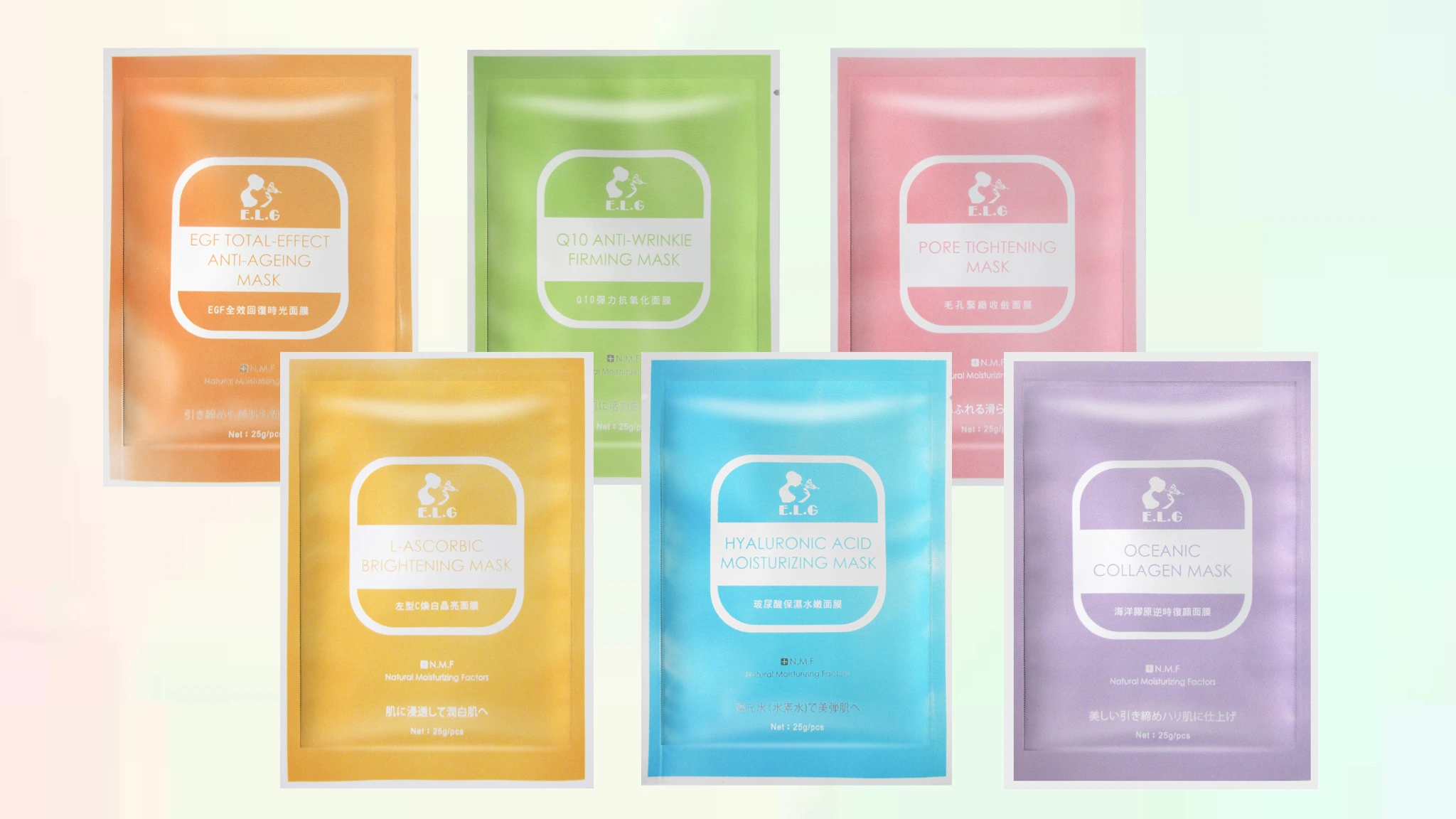 E.L.G隱形纖維布膜系列規格為25g 一片,共分為六款,適於任何肌膚,製造於台灣台南佳里區依洛嘉國際實業有限公司。使用方法:潔面後,將面膜從袋子中取出,取下珍珠紙膜,將面膜平敷於面部,15-20分鐘後取下,取下輕拍臉部可以幫組精華液吸收,至吸收即可。