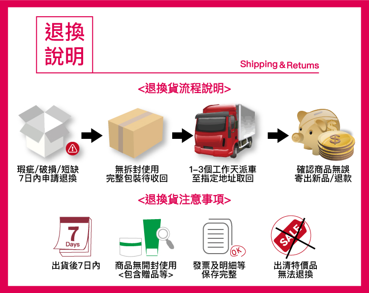 3.退換貨注意事項:退貨的商品必須必須回復原狀,亦即必須回復至您收到商品時的原始狀態 ( 包含商品主體、附件、內外包裝、隨機文件、贈品、活動贈品等 )